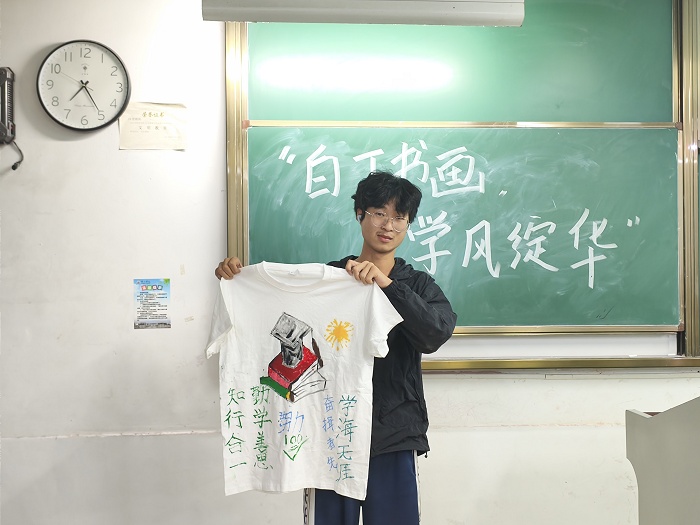 翌日举行的“白T书画,学风绽华”活动则将创意延伸至服饰图案设计领域。同学们以小组为单位,在纯白T恤上进行创作,将学习感悟、专业特色通过书法、绘画等形式生动呈现。活动现场气氛热烈,各小组通力合作,创作出了一批富有创意、主题鲜明的作品。在作品展示环节,各组代表详细阐述了设计理念,最终评选出的三组优秀作品并予以奖励。