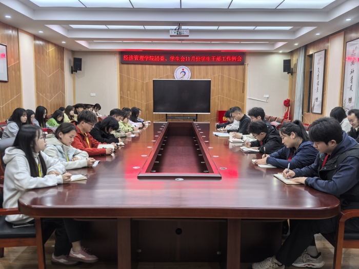 11月9日19时 经济管理学院在行政楼会议室召开团委、学生会11月份学生干部工作例会,院团委副书记李斌、全体学生会干部参加会议,会议由院团委(学生)副书记王子申主持。