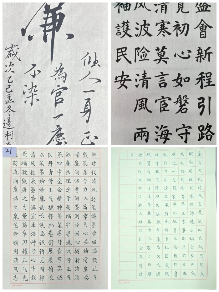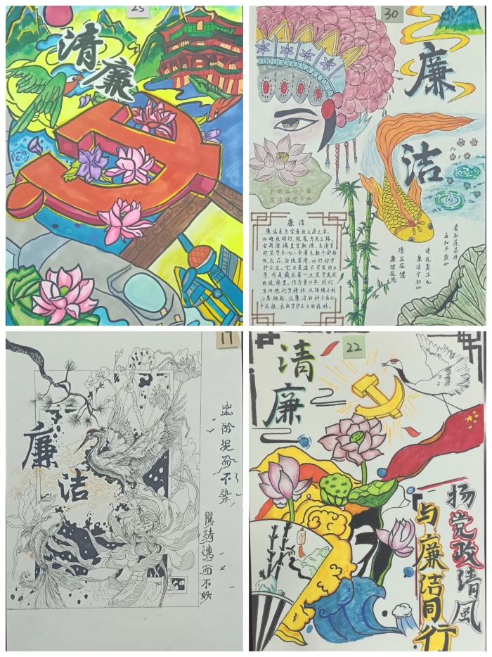 活动中,同学们围绕廉洁诗词、家风家训等主题进行创作,以笔墨书写清廉初心。书法组不同书体各具韵味,或端庄隽秀,或洒脱刚劲,字里行间满是对廉洁品格的尊崇;绘画组的同学则巧思构图,用丰富的色彩和细腻的笔触,勾勒出对清廉风尚的向往。最终,经过评委打分与线上投票,书法作品中边柯嘉、郑雨涵、刘思源同学获得一等奖;瞿思媛、李锐、焦华艺、余诗诗、江奕萱同学获得二等奖;郝浚杰、吕岩等同学获得三等奖。绘画作品中姚佳悦、王丽颖同学获得一等奖;王婉莹、丁怡丹、程晨、刘思源同学获得二等奖;刘亦凤、何虹瑾等同学获得三等奖。