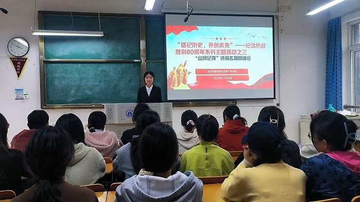 为纪念中国人民抗日战争暨世界反法西斯战争胜利80周年,2025年11月26日,经济管理学院学生第一党支部在横江校区1403教室举办抗战诗词朗诵会。支部书记李金云主持活动,支部全体党员和入党积极分子参加。