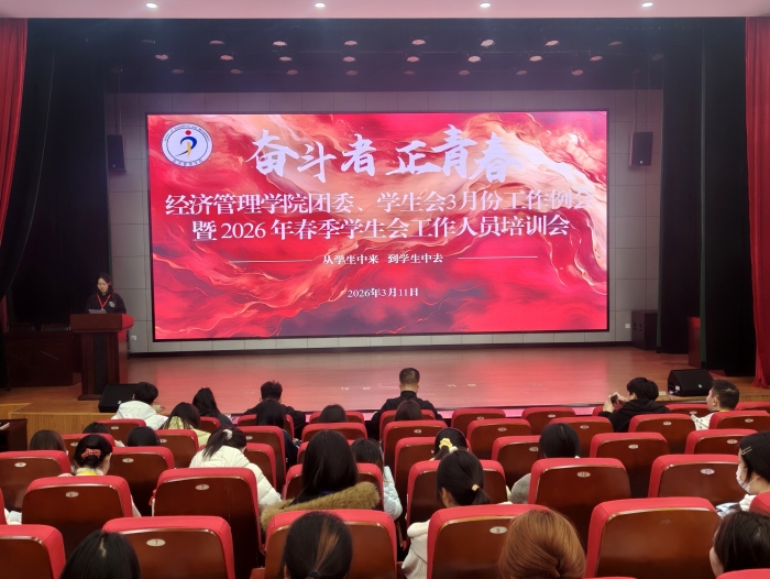 3月11日下午,经济管理学院团委、学生会在横江校区报告厅召开3月份工作例会暨2026年春季学生会工作人员培训会。院团委副书记李斌、团委学生会全体成员参会。会议由主席团成员邢珂涵主持。