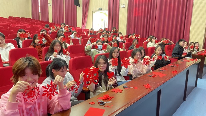 红纸在指尖翻转,剪刀游走,碎屑纷飞。23级学生王晓悦屏住呼吸,完成了最后一道剪裁。她轻轻展开作品,一只栩栩如生的“春”字蝴蝶跃然掌上,周围响起同学们的惊叹。这是黄山学院经济管理学院非遗剪纸课的现场,但这不是一堂手工艺兴趣课,而是学院精心设计的“五个一”劳动育人实践课程中的重要一环。